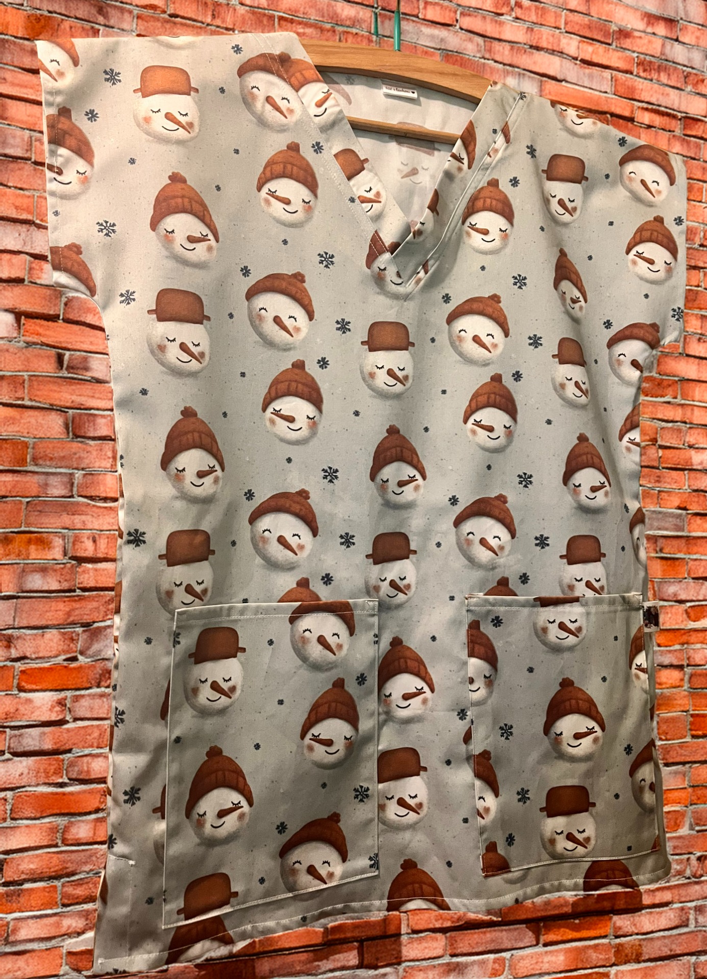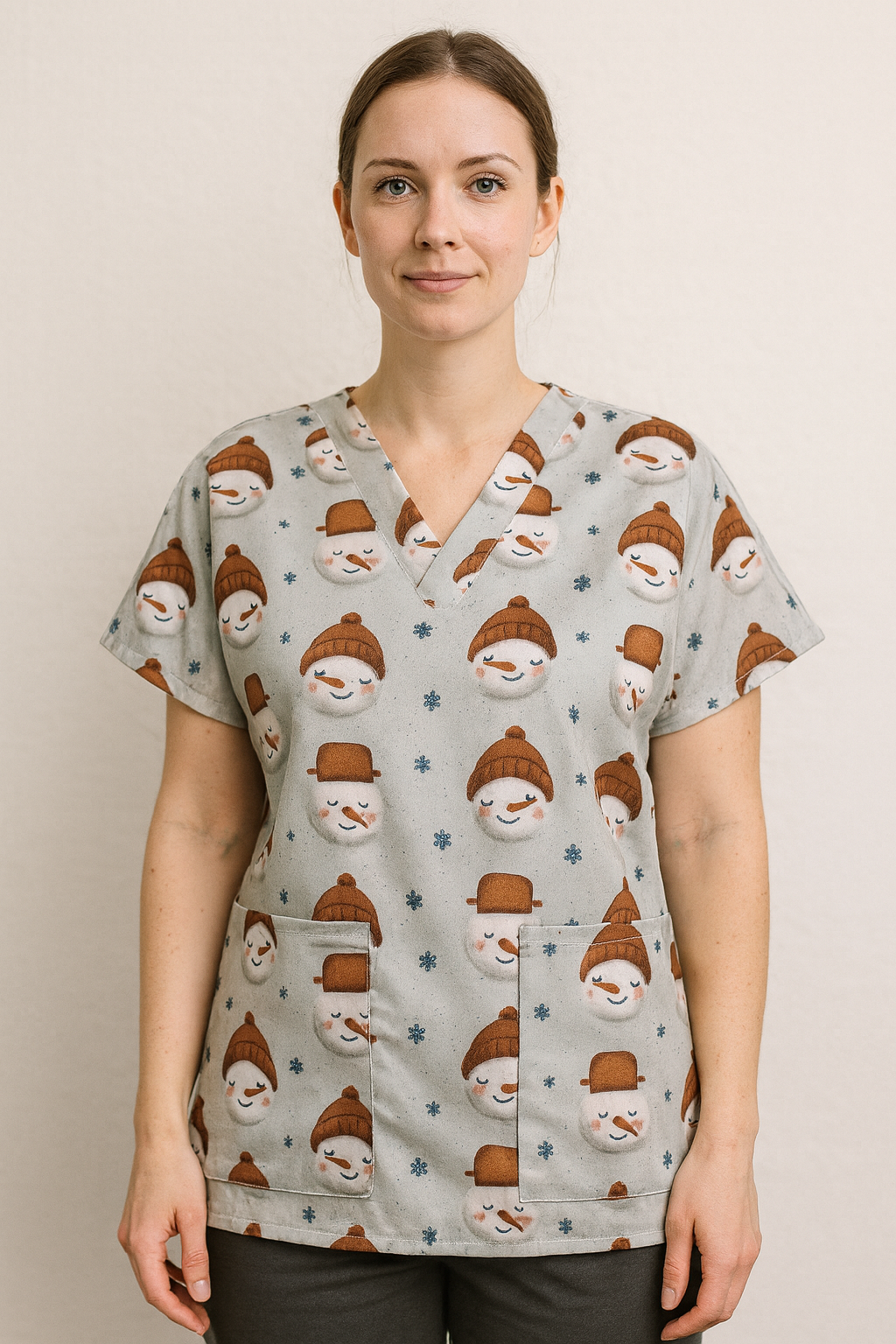Objevte kouzlo zdravotnické haleny s motivy roztomilých sněhuláků a dodejte vašemu pracovnímu dni tu dokonalou zimní atmosféru