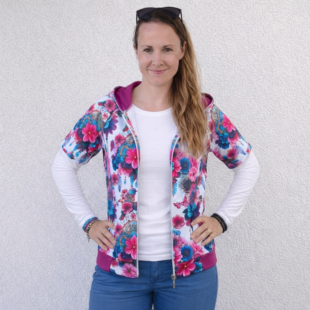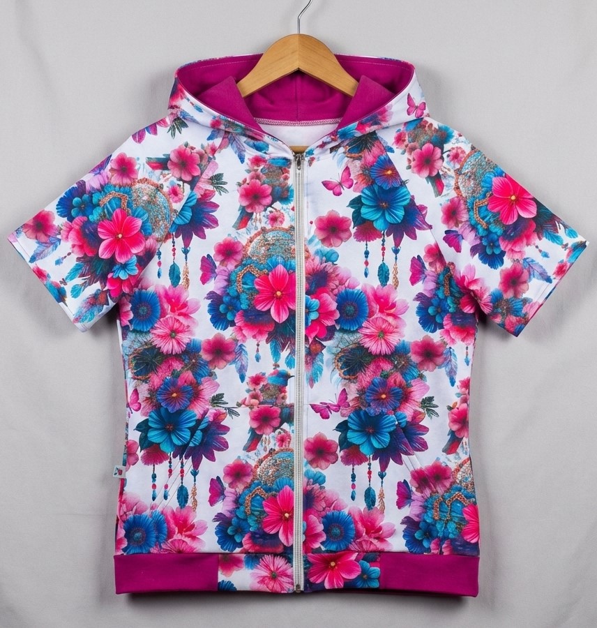 Krásná mikina ala mikina s krátkým rukávem s květinovými vzory, kapucou, kapsami a zapínáním na zip