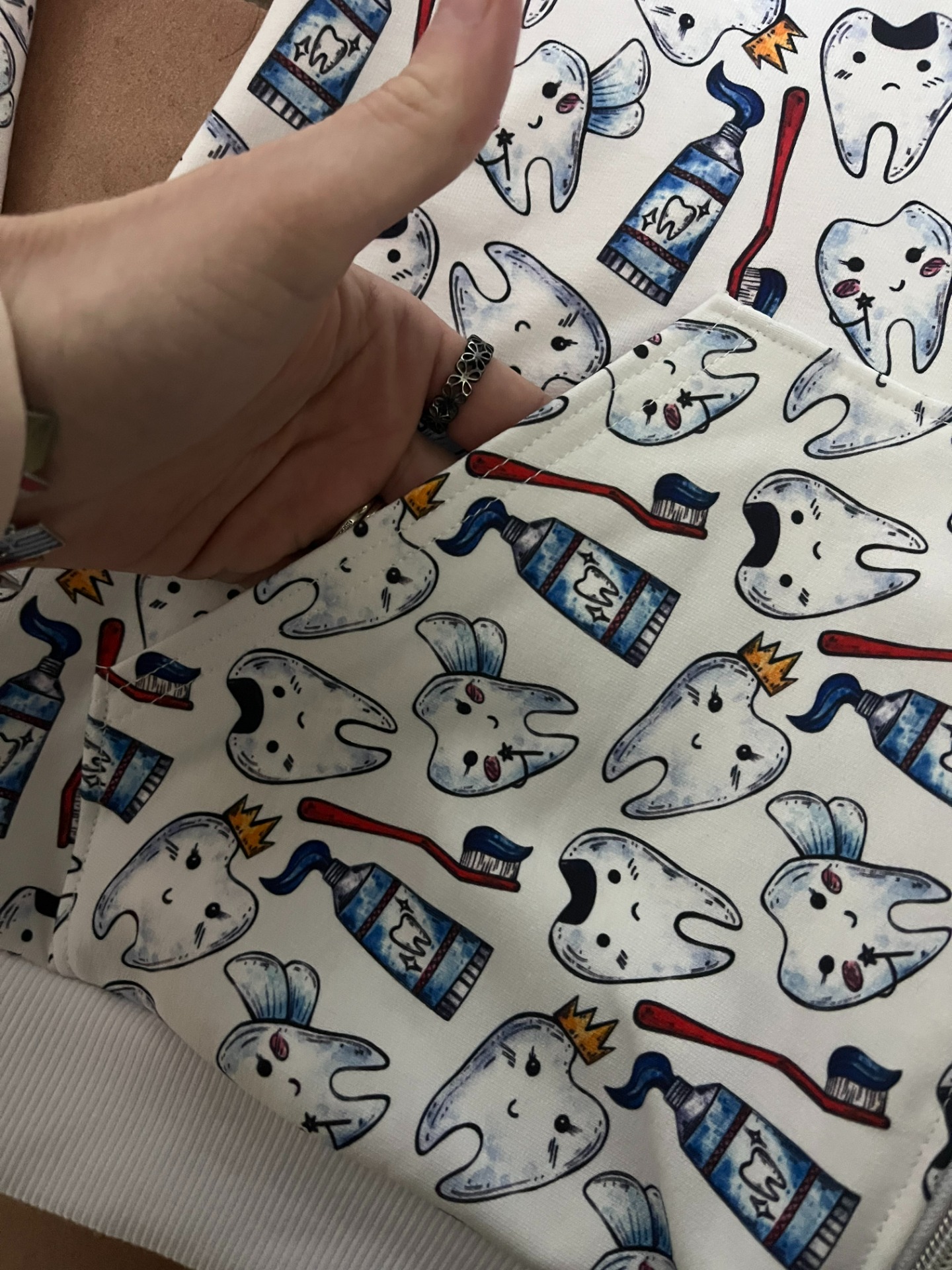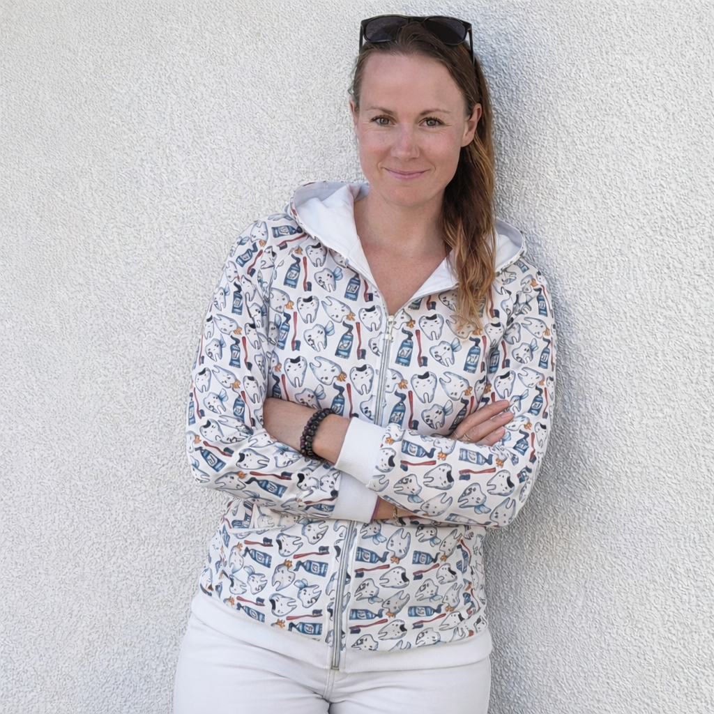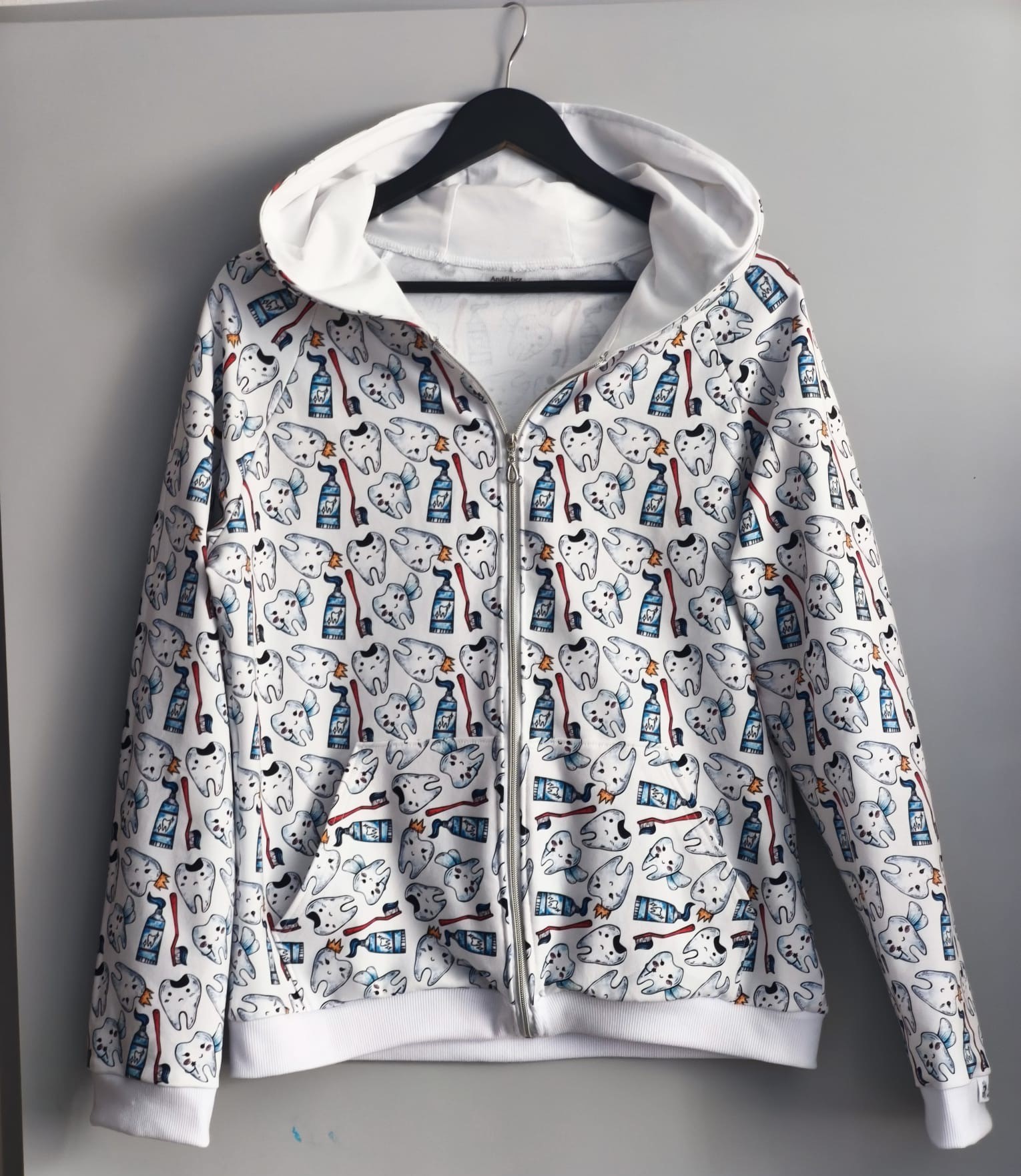 Dámská mikina na zip s kapucí a hravým potiskem v motivu dentální péče.