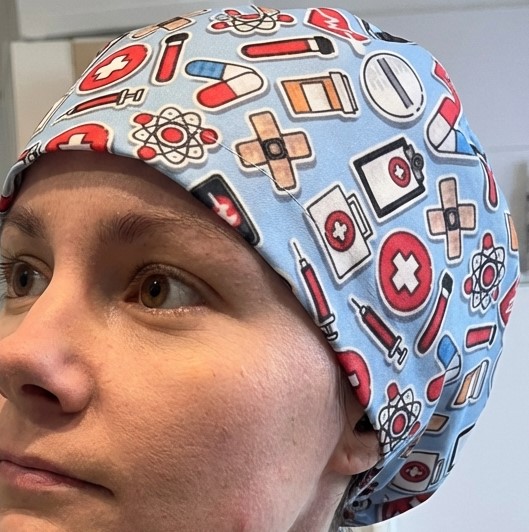 - Operační čepice z bavlněného saténu s kapkou polyesteru pro vzdušnost, zajišťuje pohodlí a prodyšnost i během nejnáročnějších operací.