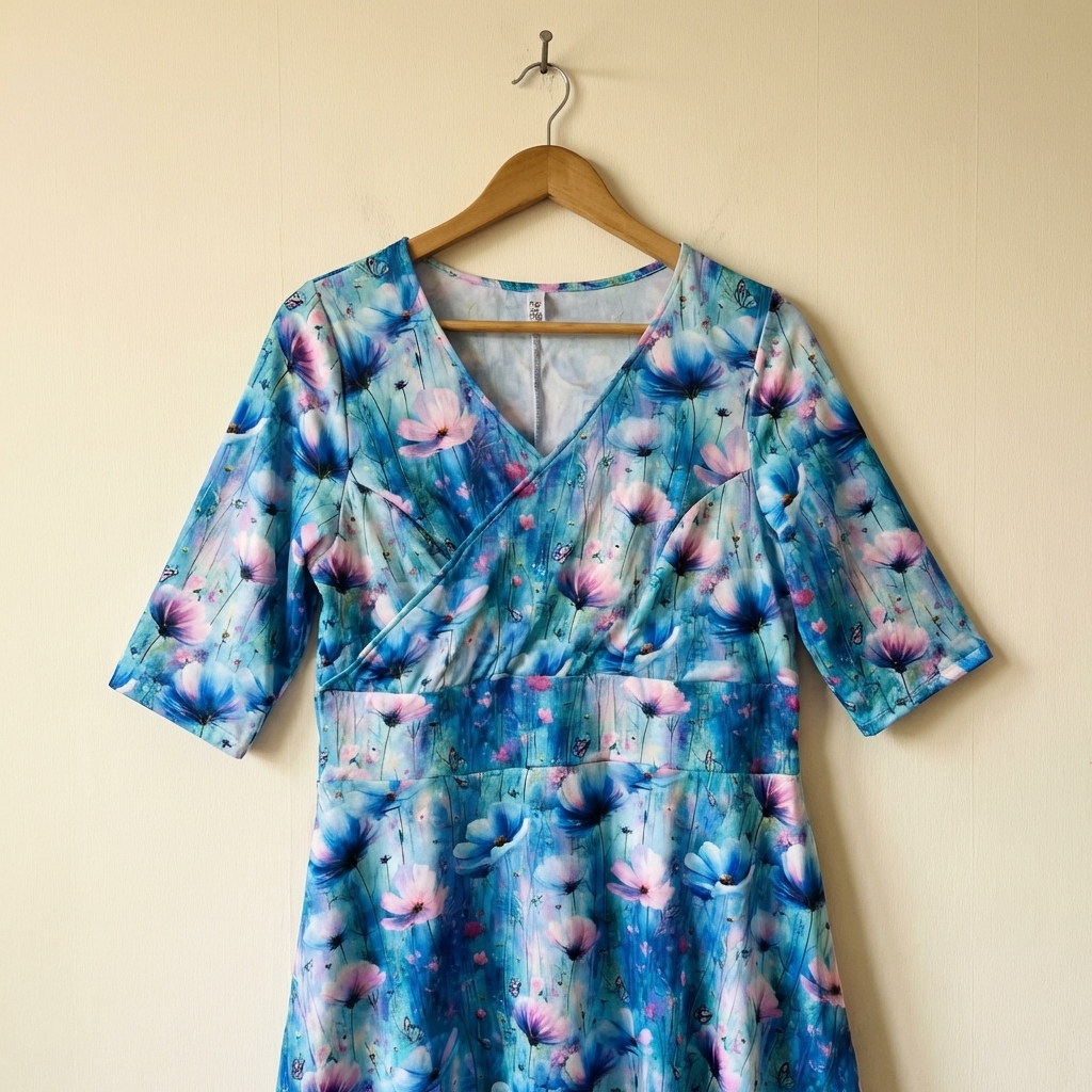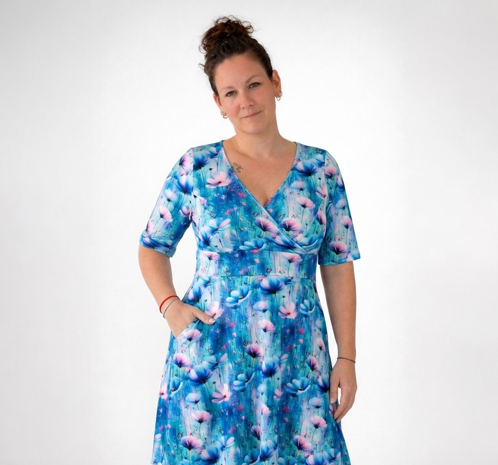 Tento střih je jako stvořený pro to, abyste se cítili sebevědomě a pohodlně. Překřížený vršek vytváří krásný dekolt, který zaujme na první pohled. Rozšiřující se sukně zajistí, že se budete cítit maximalně volně a pohodlně. Šaty jsou ušity z Milky úpletu, který je velmi pružný, na dotek příjemný,nežmolkuje, neprosvítá a má krásné barvy
