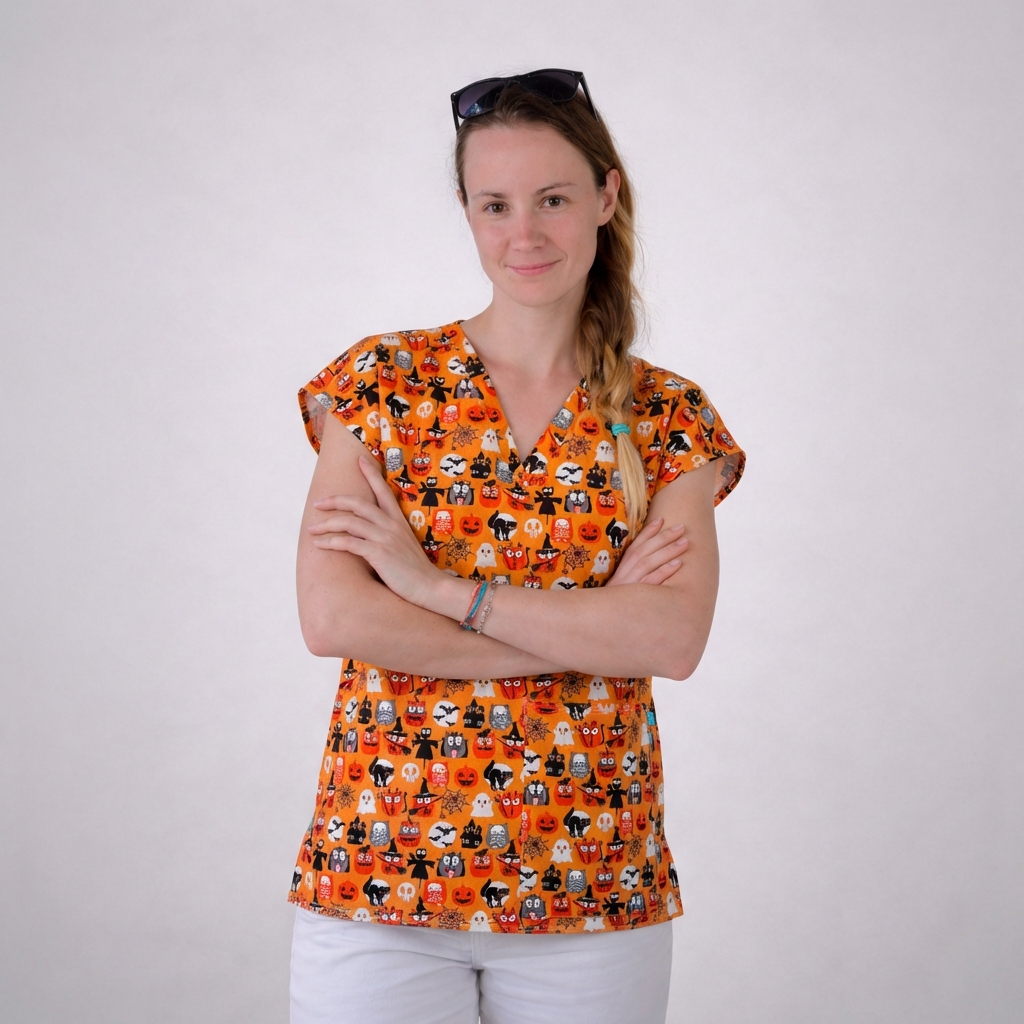 Tato zdravotnická halena s motivy ideálními na podzimní Halloween je perfektní volbou pro ty, kteří chtějí přinést trochu zábavy do pracovního dne.