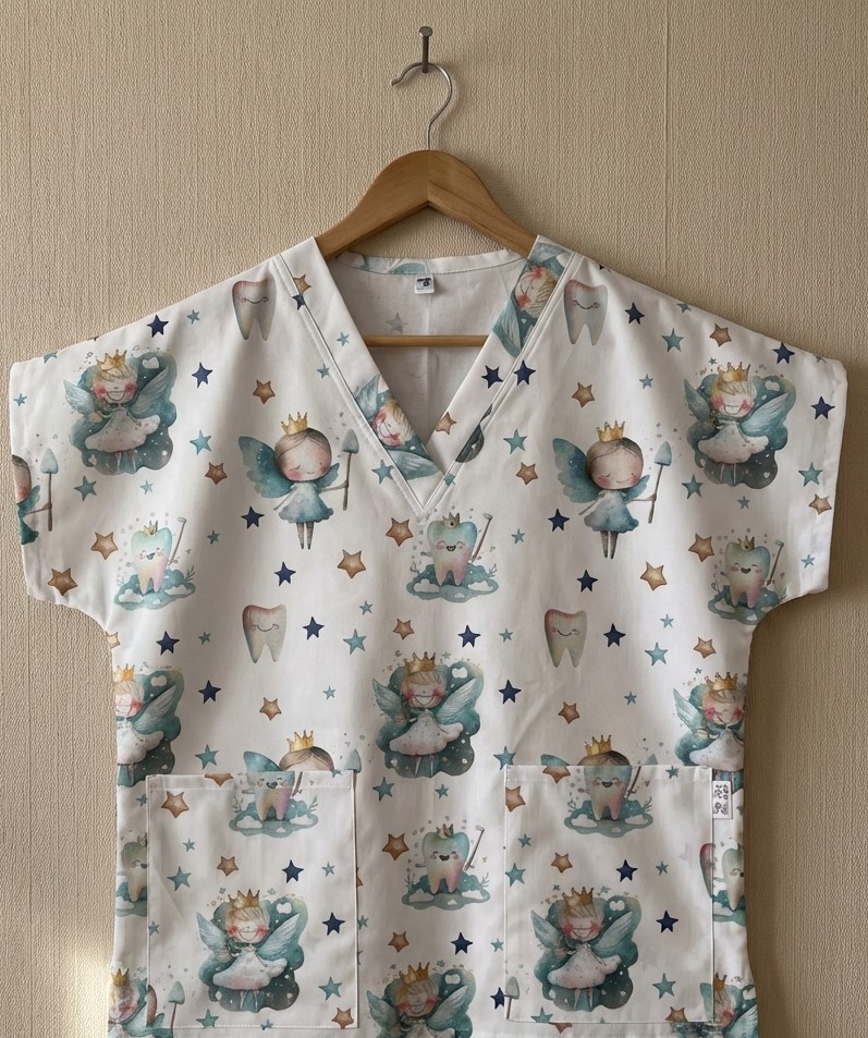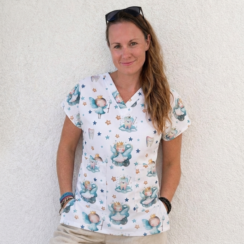 - Krásná halenka s přinechanými nebo našívaný rukávy s motivem zubní víly a zoubků ve více barvách