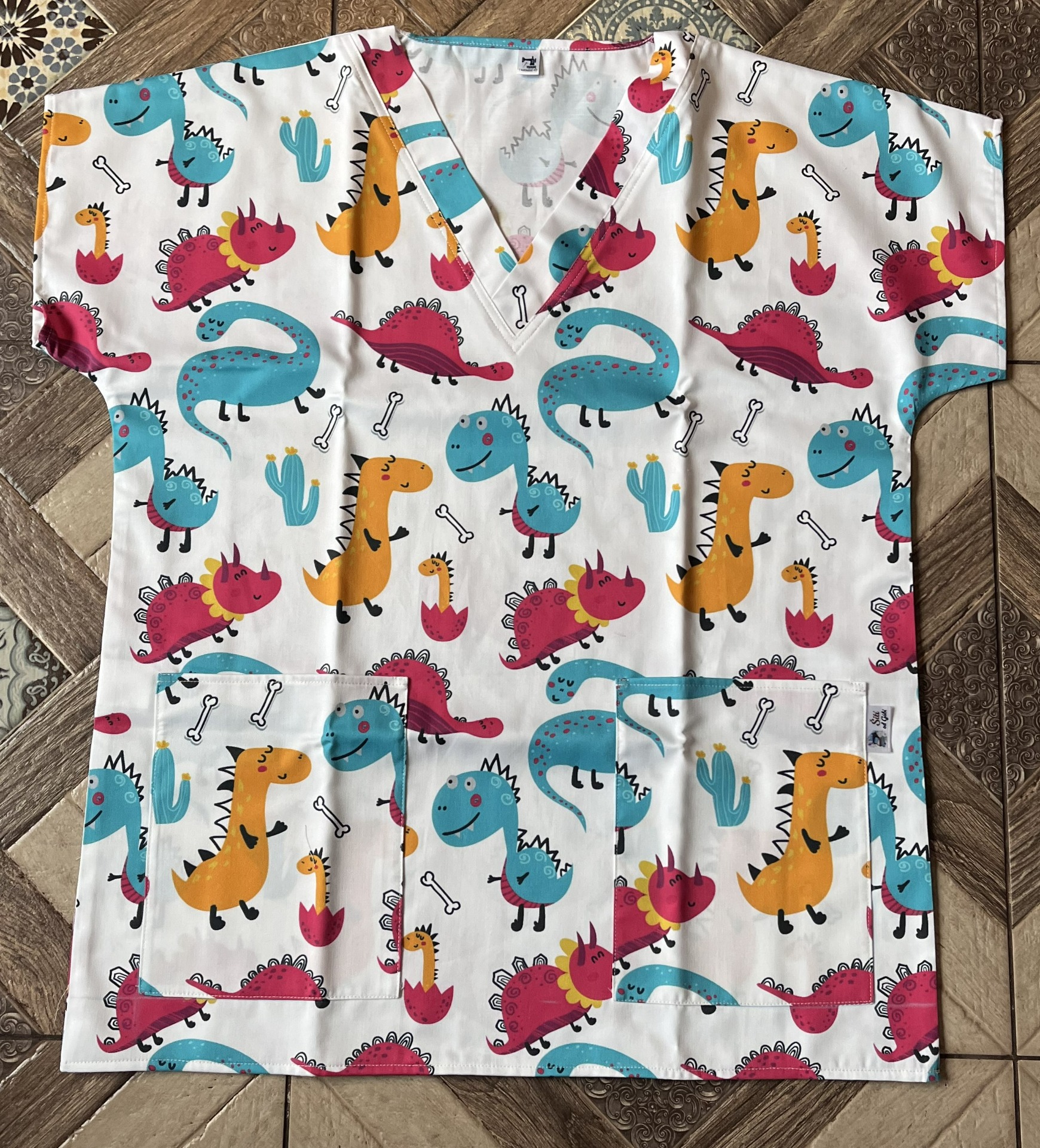 Objevte kouzlo zdravotnické haleny s motivy dinosaurů, která přináší radost do každodenního shonu zdravotníků.
