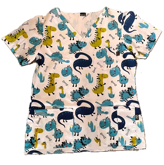Objevte kouzlo zdravotnické haleny s motivy dinosaurů, která přináší radost do každodenního shonu zdravotníků.