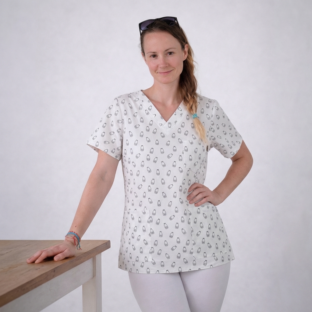 Tato originální halenka, ideální na dětské oddělení, porodnici, neonatologii, nebo alergologii je vytvořena z lehkého bavlněného popelínu