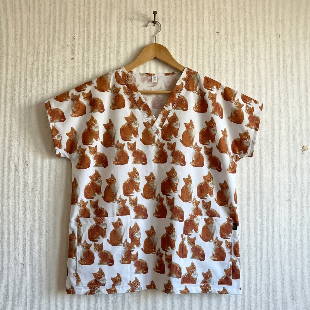 Zdravotnická halenka s různými obrázky kočičky v rezavé barvě