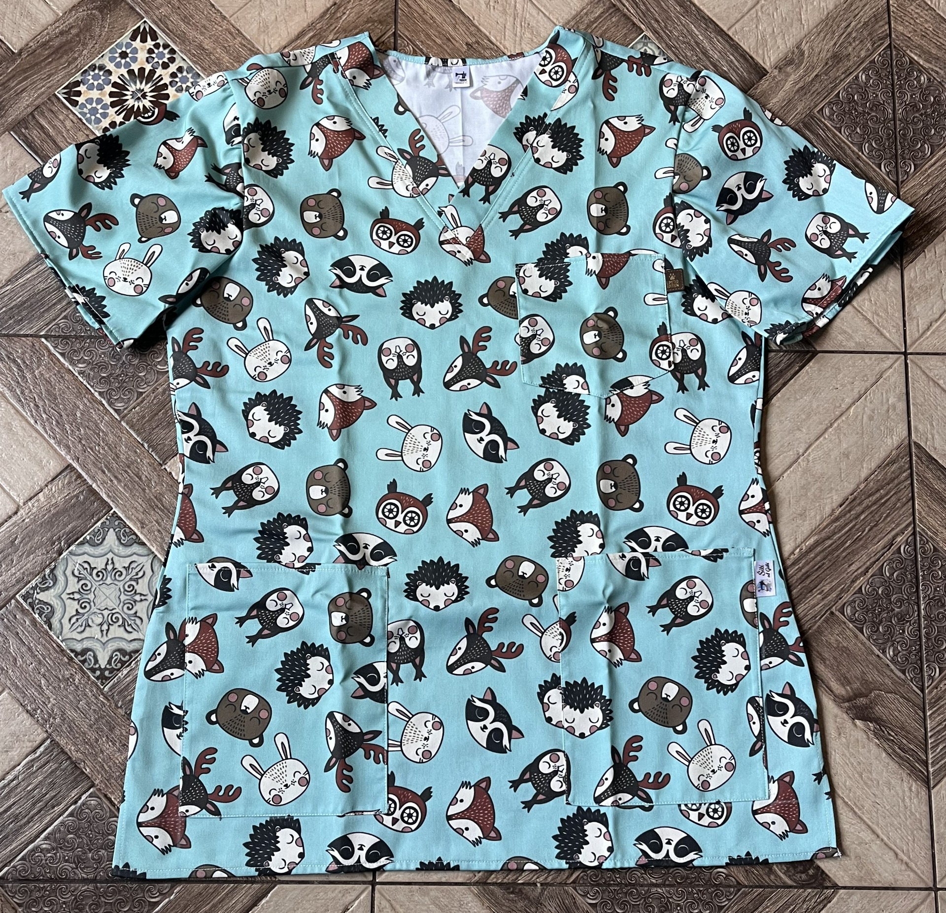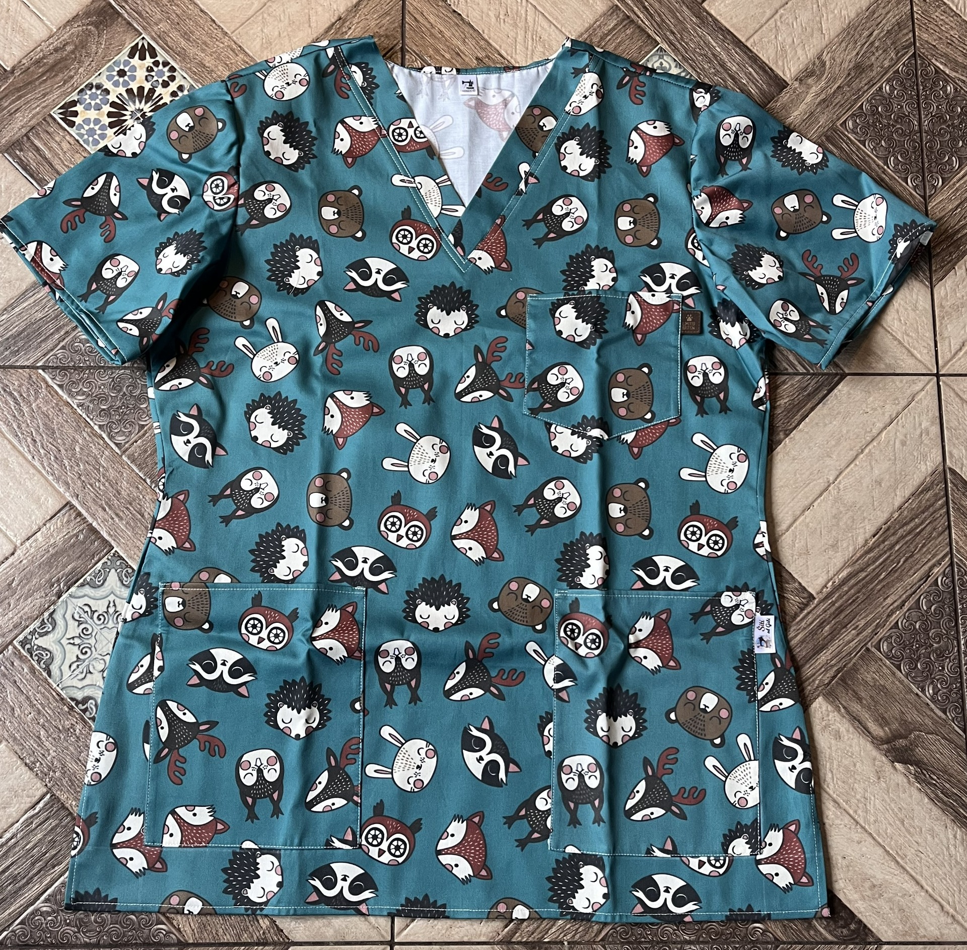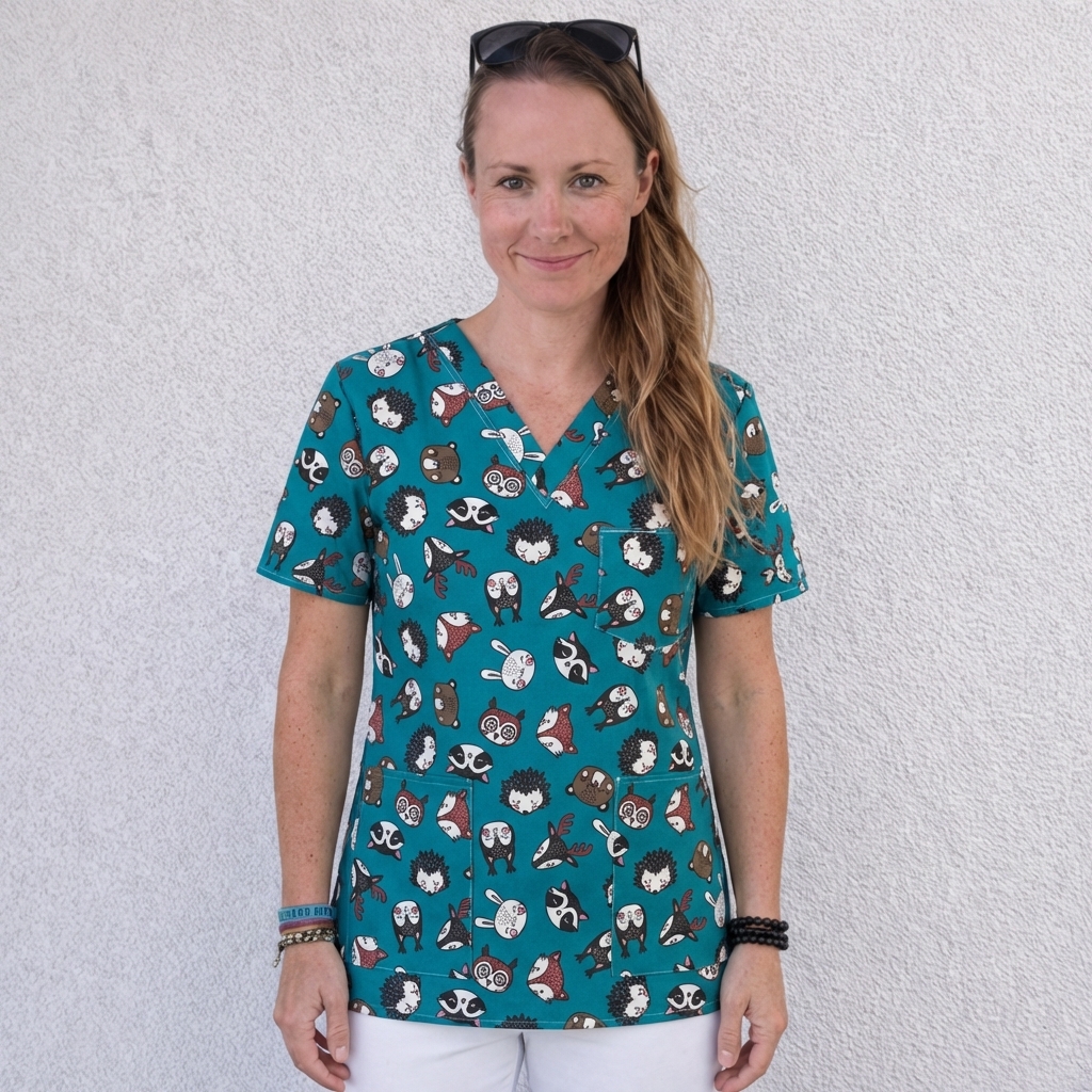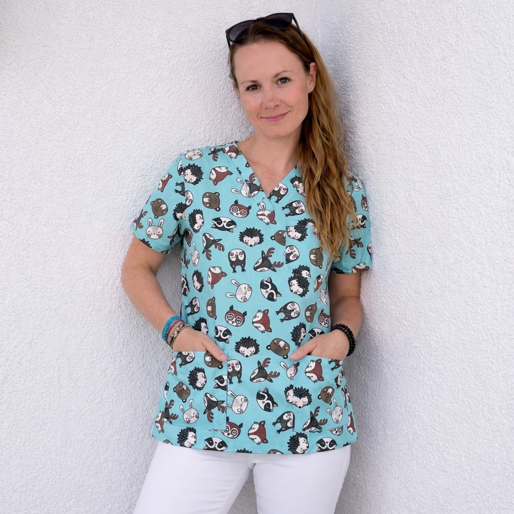 Zdravotnická halenka s motivem obličejů zvířátek v několika barevných variantách