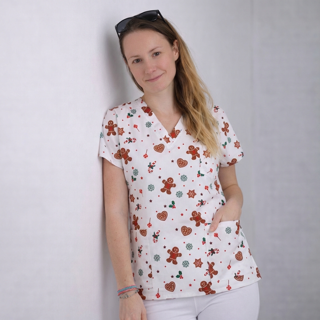 Tato zdravotnická halena s motivy ideálními na zimu a Vánoce je skvělou volbou pro ty, kteří chtějí přinést trochu zábavy a vůně perníčků do pracovního dne.