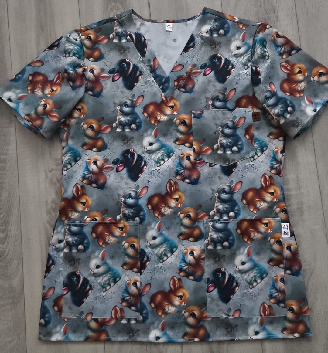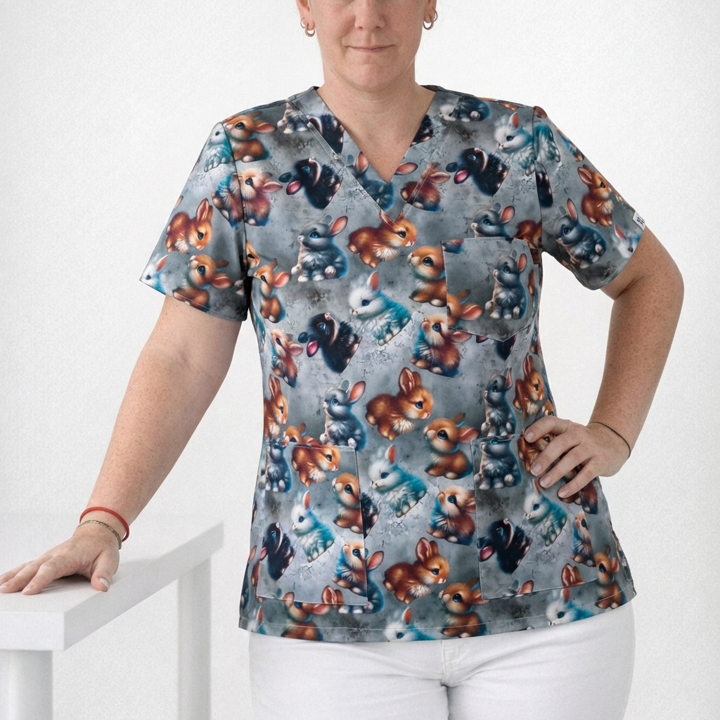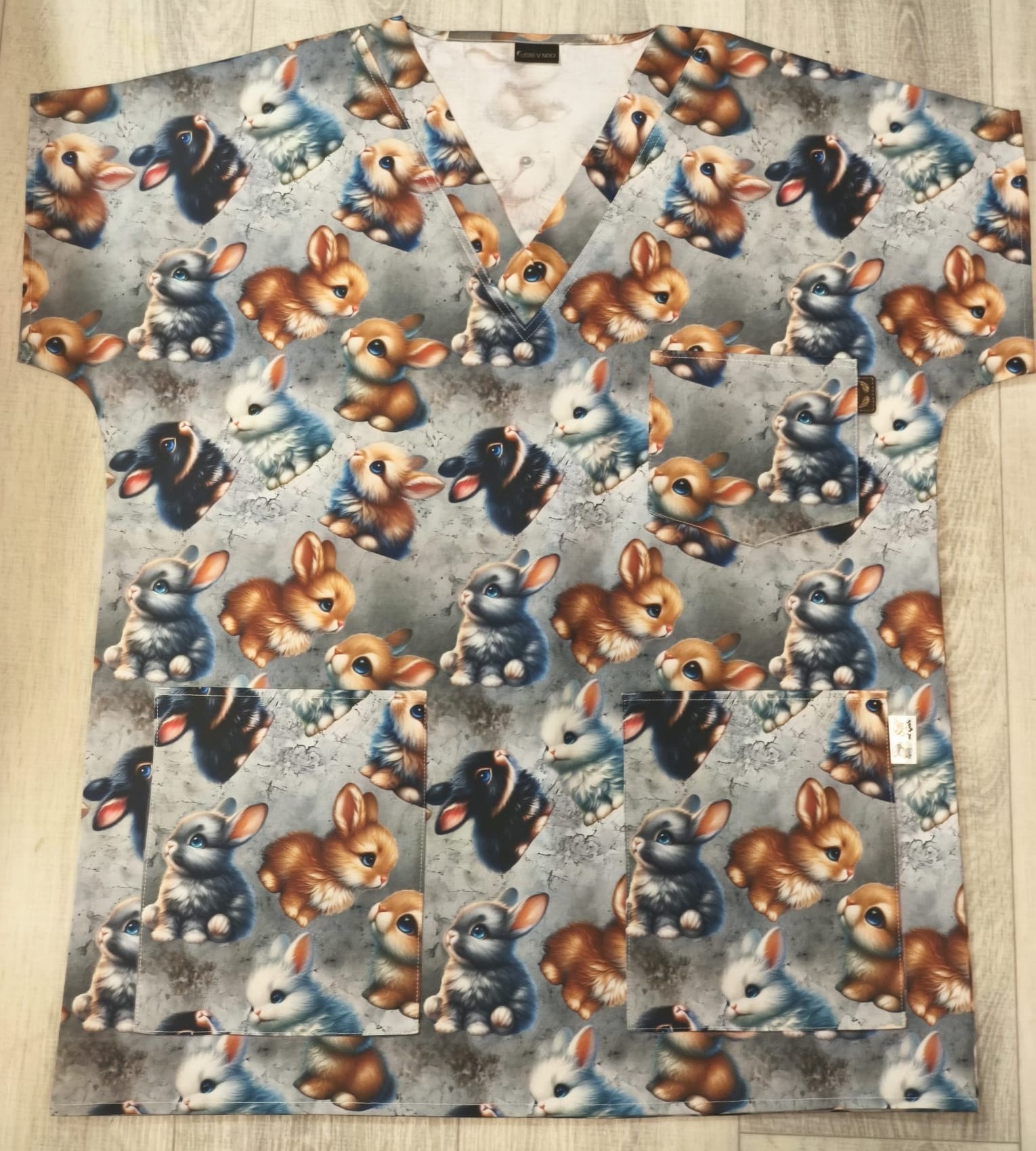 Zdravotnická halena s veselými vzory zajíčků vhodnými pro každou sestřičku, laborantku, doktora či doktorku. Ideální pro jarní čas.