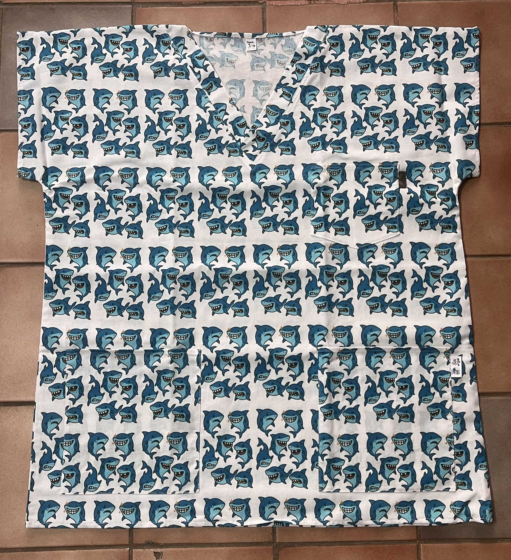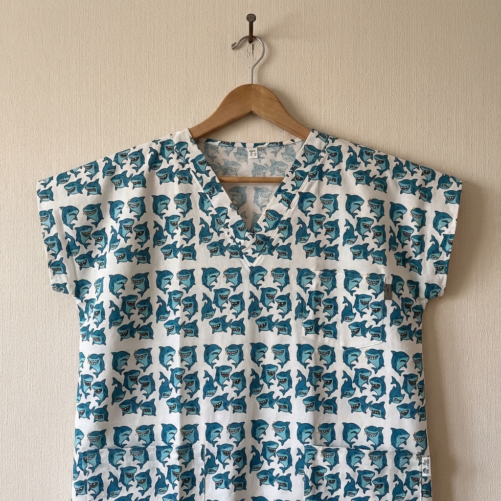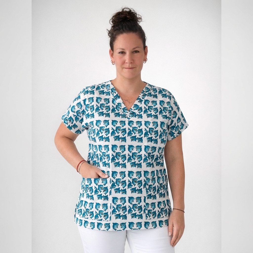 Zdravotnická halena se vzory žraloků pro každou sestřičku, laborantku, doktora či doktorku. Ideální třeba pro zubaře.